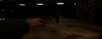 You are a librarian, working late and stuck inside due to the torrential downpour outside. As the night goes on, you start to hear footsteps. Wandering around the library, you discover an eyeball-less maniac destroying the library with a baseball bat - except this maniac looks exactly like you.